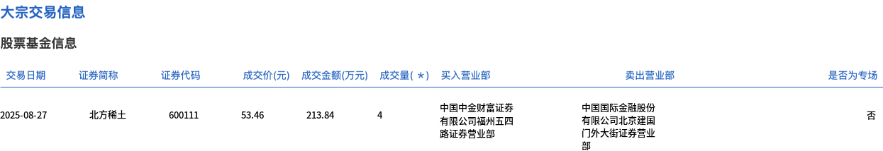 北方稀土今日大宗交易平价成交4万股,成交额213.84万元