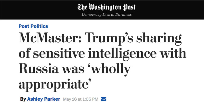 【美国安顾问:特朗普向俄罗斯披露敏感情报“完全恰当”】美国国家安全顾问在周二的记者会上表示,总统特朗普在白宫会晤俄罗斯外长和驻美大使时,披露敏感信息的行为是完全合适的。