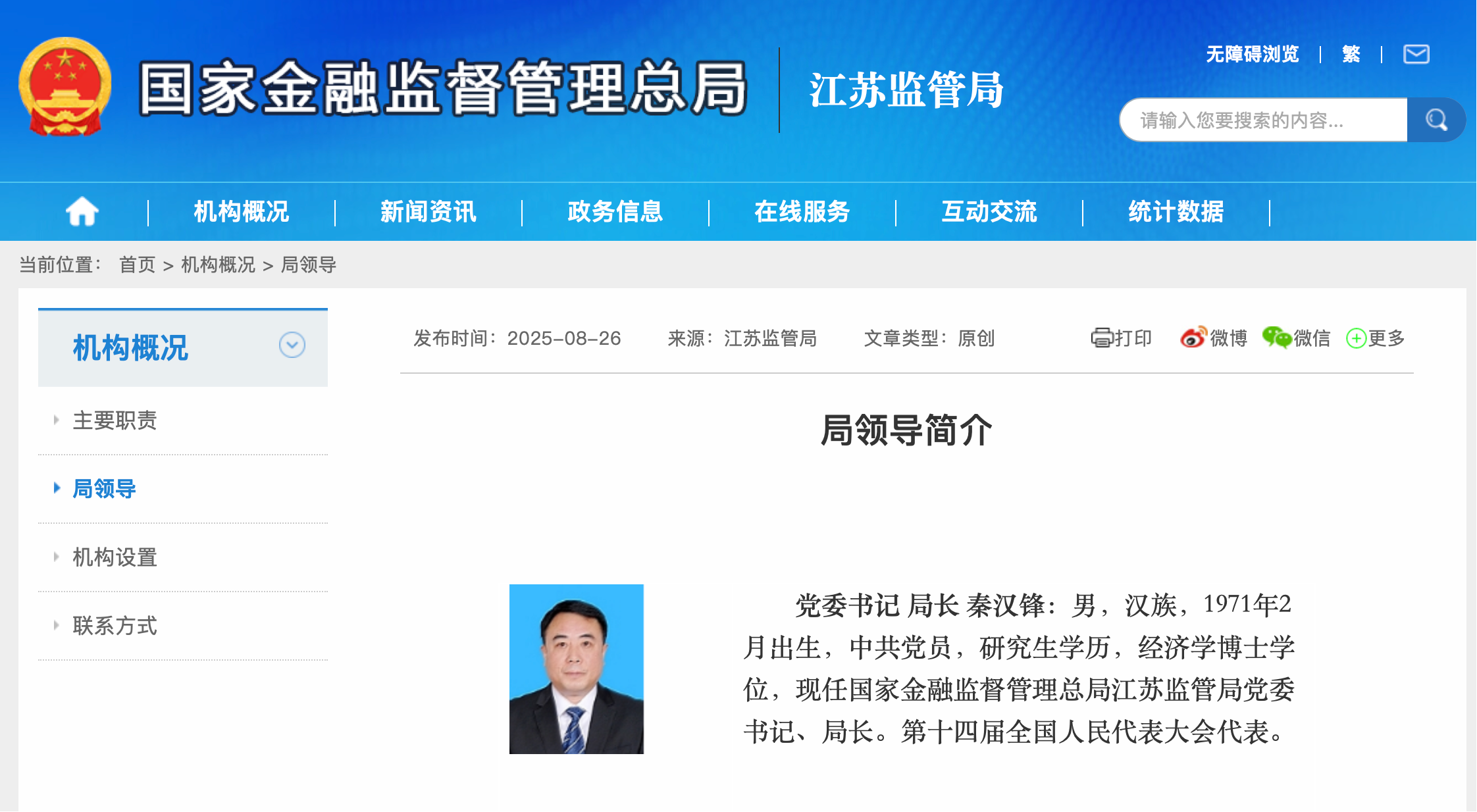 8月26日,国家金融监督管理总局江苏监管局官网更新局领导信息,秦汉锋任江苏金融监管局党委书记、局长。