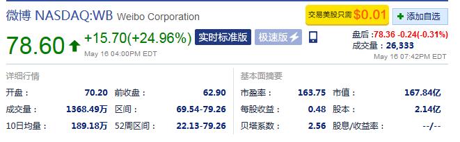 财报发布后,微博股价周二大涨25%,盘中最高价一度接近80美元,市值约170亿美元,创历史新高。