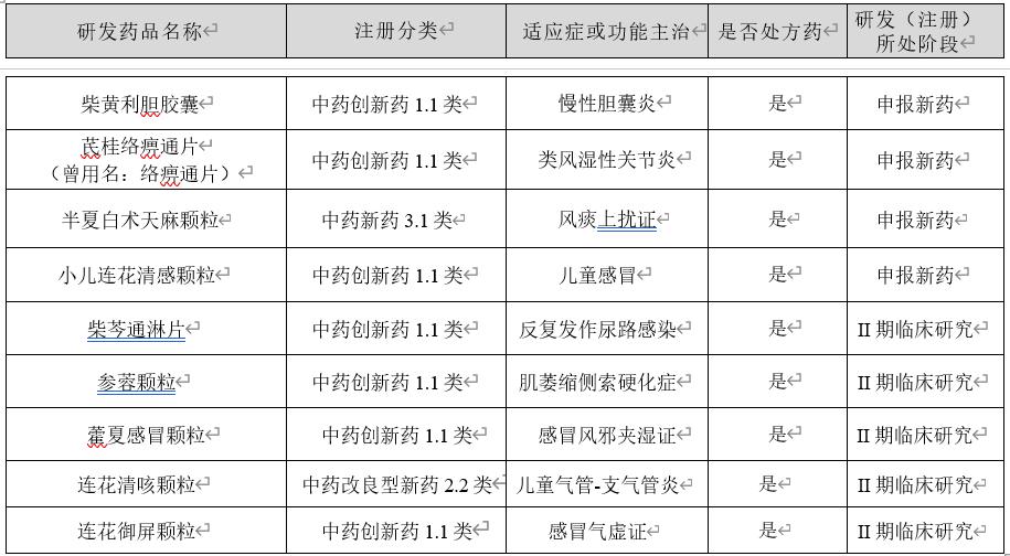 目前,公司在研Ⅱ期临床以上的中药项目已达9项,有7项为1.1类中药创新药。柴黄利胆胶囊、芪桂络痹通片、小儿连花清感颗粒、半夏白术天麻颗粒新药上市申请也已获得受理,另有5个品种处于Ⅱ期临床研究。