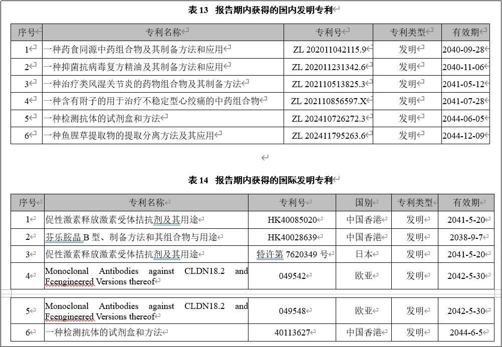 截至本报告期末,公司有效专利870项,其中中药有效专利484项,为公司可持续发展构筑坚实壁垒。高研发投入也为公司扩大国际化版图提供有力支撑,目前创新专利中药已在全球50余个国家和地区注册上市,报告期内还取得了多项国际发明专利,在中医药出海浪潮中树立起“中国方案”典范。