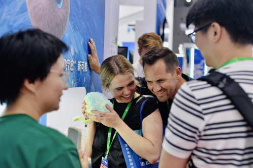 “超级球球”不仅引起了普通成年观众的兴趣,不少中小学生也被它可爱的毛绒外观吸引,上手抚摸感受。还有来自韩国、日本、印度、中亚、欧洲等国家和区域的外籍观众,在翻译帮助下向“超级球球”团队成员了解产品细节,表达合作兴趣。面对外籍观众,球球也使用英语做了自我介绍。
