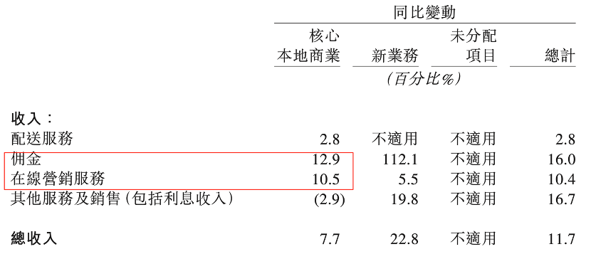 翻看美团往期财报,核心本地商业不同收入项目往往保持同等的增长节奏(配送服务,佣金,在线营销增速差多在5个百分点以内),其原理也比较简单,虽然平台为商家提供多重服务,但平台对商家的总货币化率不能有太大波动(否则不利于商家的预期管理),因此不同业务收入多围绕GMV增速进行调整,不会有太大偏差。