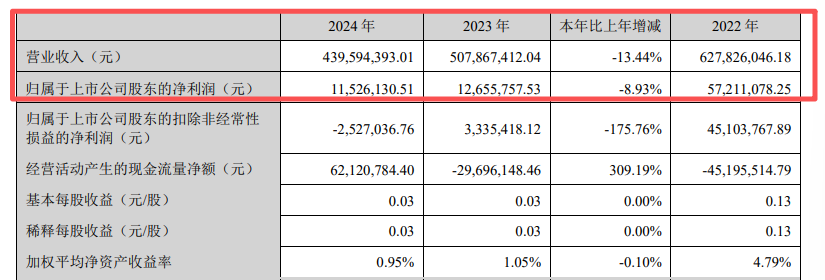 然而,无论是营收还是净利,金现代近三年一路下滑。以营收为例,从2022年、2023年,到2024年,金现代实现营收分别为6.28亿元、5.08亿元、4.40亿元;归属于上市公司股东的净利润分别为5721.11万元、1265.58万元、1152.61万元,直到2025年上半年的-2242.99万元。