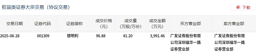 8月28日,德明利大宗交易成交41.2万股,成交额3991.46万元,占当日总成交额的3.67%,成交价96.88元,较市场收盘价98元折价1.14%。