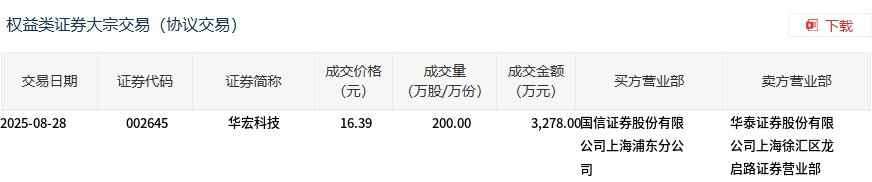 8月28日,华宏科技大宗交易成交200万股,成交额3278万元,占当日总成交额的3.35%,成交价16.39元,较市场收盘价16.64元折价1.5%。