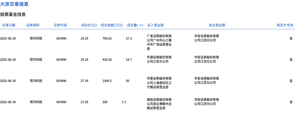8月28日,恒为科技大宗交易成交99.3万股,成交额2799.68万元,占当日总成交额的3.56%,成交均价28.19元,较市场收盘价30.83元折价8.55%,其中最高成交价29.29元,最低成交价27.39元。