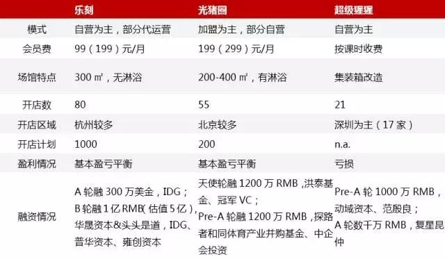 新型健身房因为有和传统大型连锁健身房明确差异的定位,二者之间并不存在刺刀见红的竞争,反而形成了多层次的竞争格局。目前跑在前列的新型公司包括乐刻、光猪圈、超级猩猩等。