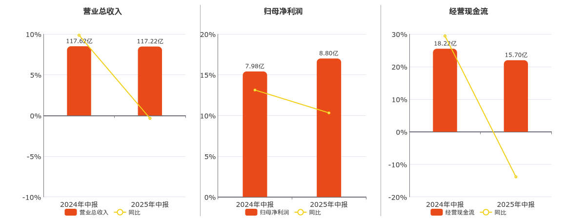 公司营业总收入为117.22亿元,较去年同报告期营业总收入减少4058.15万元,同比较去年同期下降0.35%。归母净利润为8.80亿元。经营活动现金净流入为15.70亿元,较去年同报告期经营活动现金净流入减少2.52亿元,同比较去年同期下降13.84%。