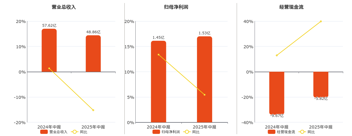 公司营业总收入为48.86亿元,较去年同报告期营业总收入减少8.76亿元,同比较去年同期下降15.21%。归母净利润为1.53亿元。经营活动现金净流入为-5.82亿元,在已披露的同业公司中排名第18。
