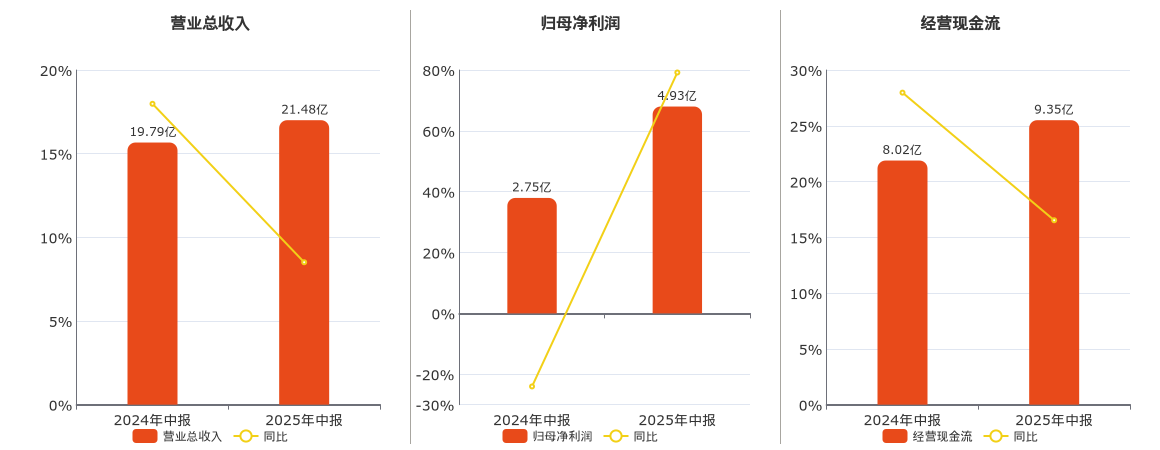 公司营业总收入为21.48亿元,在已披露的同业公司中排名第28。归母净利润为4.93亿元。经营活动现金净流入为9.35亿元。