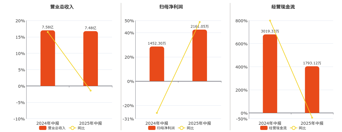 公司营业总收入为7.48亿元,在已披露的同业公司中排名第41,较去年同报告期营业总收入减少1066.64万元,同比较去年同期下降1.41%。归母净利润为2161.05万元,在已披露的同业公司中排名第45。经营活动现金净流入为1793.12万元,在已披露的同业公司中排名第41,较去年同报告期经营活动现金净流入减少1226.21万元,同比较去年同期下降40.61%。