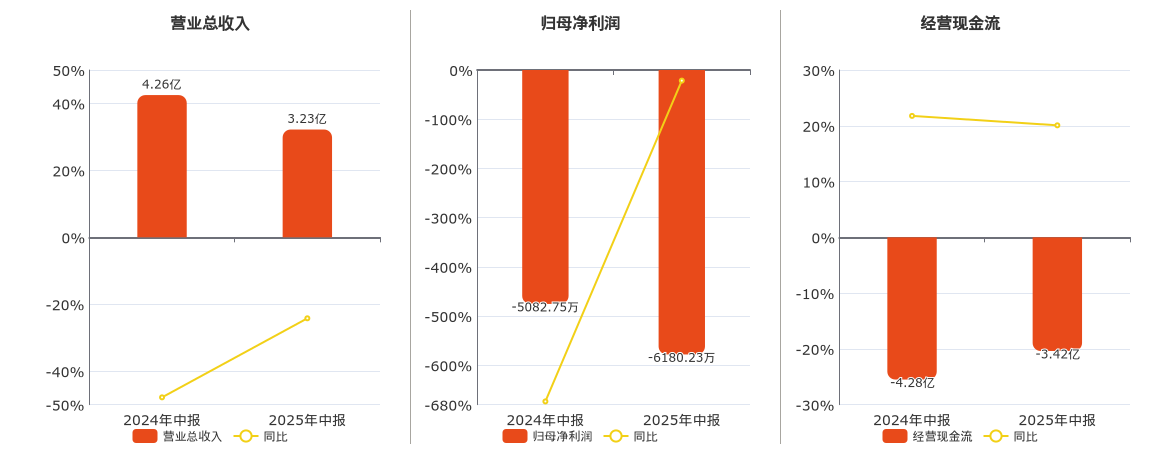 公司营业总收入为3.23亿元,在已披露的同业公司中排名第62,较去年同报告期营业总收入减少1.03亿元,同比较去年同期下降24.20%。归母净利润为-6180.23万元,在已披露的同业公司中排名第101,较去年同报告期归母净利润减少1097.48万元。经营活动现金净流入为-3.42亿元,在已披露的同业公司中排名第109,较去年同报告期经营活动现金净流入增加8585.09万元,实现2年连续上涨。