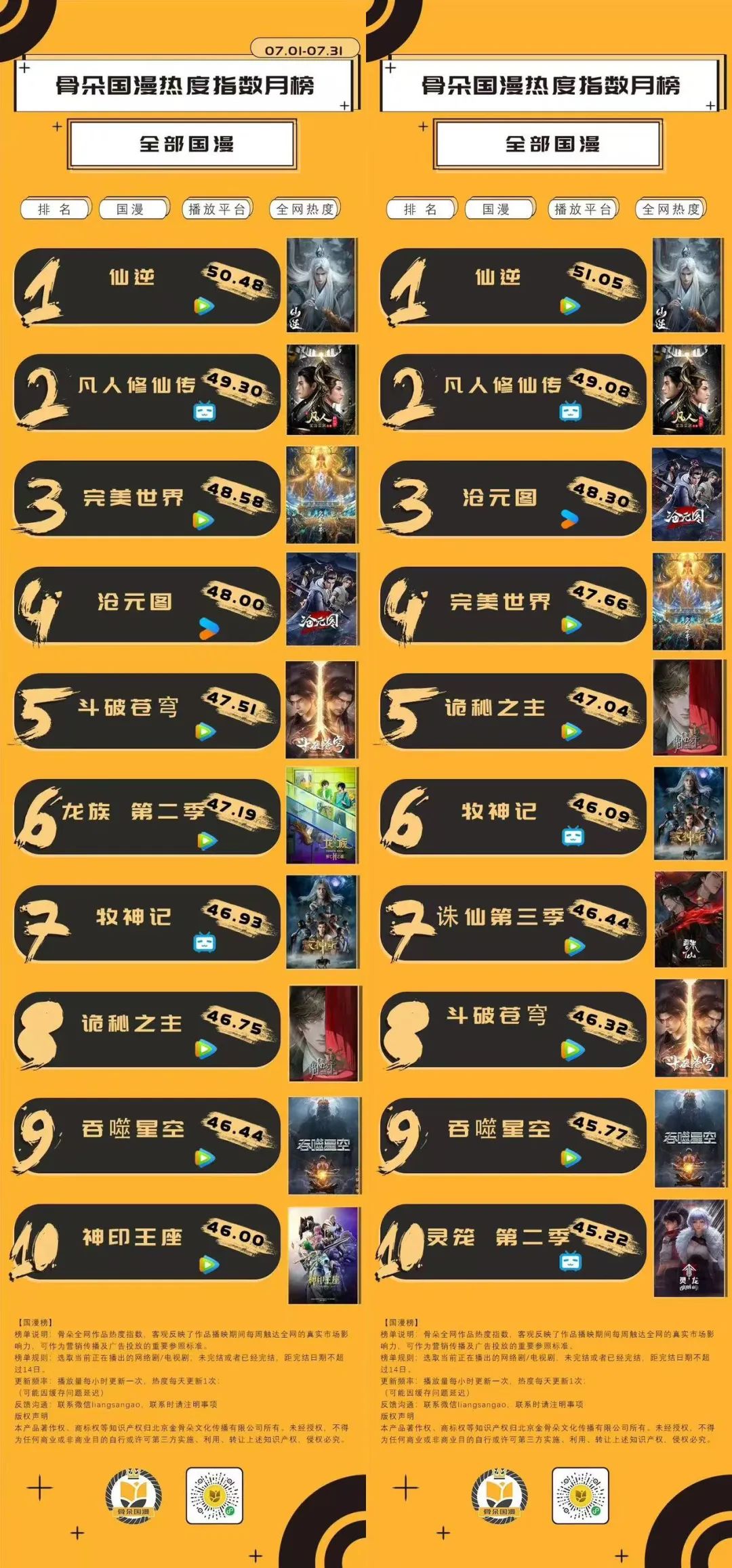根据骨朵国漫热度指数月榜,2025年6月和7月国漫热度前十全部由头部项目霸屏,其中年番项目占据了七到八席。
