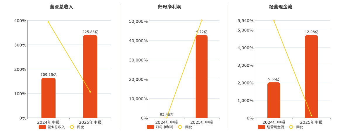 公司营业总收入为225.83亿元,在已披露的同业公司中排名第1,较去年同报告期营业总收入增加116.67亿元,实现4年连续上涨,同比较去年同期上涨106.89%。归母净利润为4.72亿元,在已披露的同业公司中排名第1,较去年同报告期归母净利润增加4.71亿元,实现2年连续上涨,同比较去年同期上涨50358.80%。经营活动现金净流入为12.98亿元,在已披露的同业公司中排名第1,较去年同报告期经营活动现金净流入增加7.42亿元,实现2年连续上涨,同比较去年同期上涨133.37%。