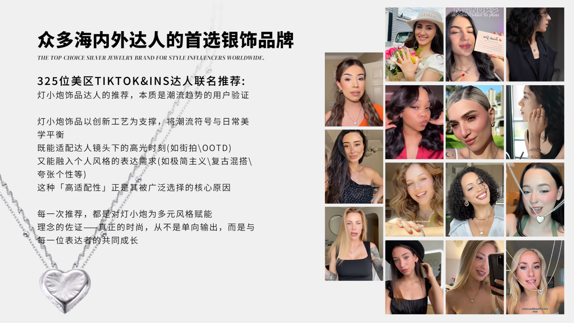 除国内市场的热度外,D-POW 灯小炮在海外市场的拓展已取得显著成果,成为品牌全球化战略的重要支撑。目前,品牌已重点布局北美市场,凭借产品优势迅速打开局面,联合 325 位美区达人(涵盖时尚、生活、街拍达人)发起联名推荐,相关内容在 TIKTOK、INS 两大社交平台形成传播热潮,多款单品因 “高适配性” 成为达人街拍、OOTD分享的高频选择,产品海外受欢迎的核心在于 D-POW 灯小炮对 “国际化审美与本地化需求” 的精准平衡:既贴合海外消费者对 “极简主义、复古混搭、夸张个性” 等多元风格的追求,又确保饰品既能适配镜头前的高光时刻,也能融入日常穿搭场景,真正实现 “场景无界、风格自由”。