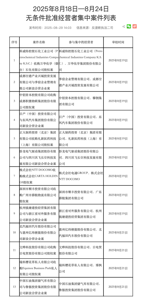市场监管总局发布2025年8月18日—8月24日无条件批准经营者集中案件列表,其中包括科威特控股石化工业公司(Petrochemical Industries Company K.S.C.)收购万华化学(烟台)石化有限公司股权案、日产(中国)投资有限公司与东风汽车集团股份有限公司新设合营企业案等。