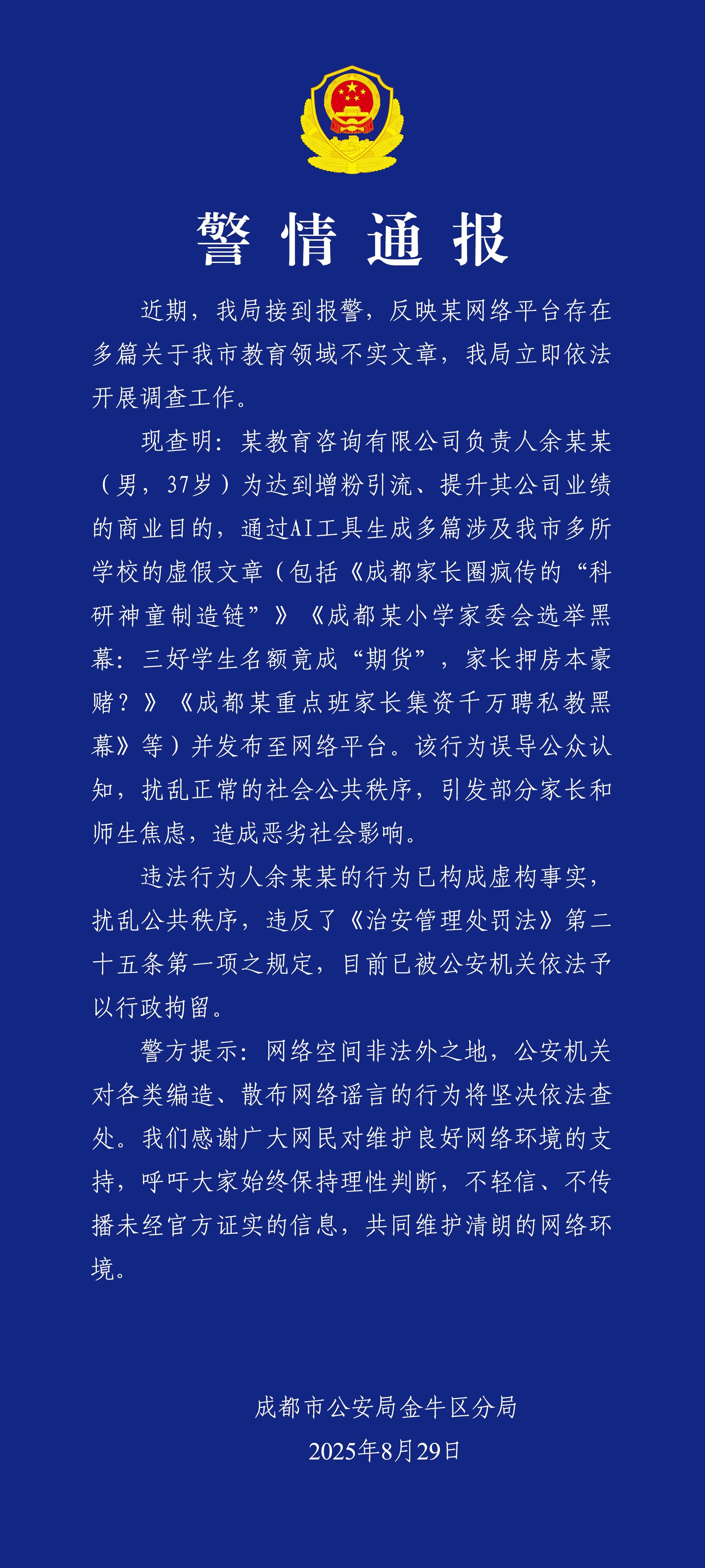 8月29日,四川成都市公安局金牛区分局发布警情通报:近期,我局接到报警,反映某网络平台存在多篇关于我市教育领域不实文章,我局立即依法开展调查工作。现查明,某教育咨询有限公司负责人余某某(男,37岁)为达到增粉引流、提升其公司业绩的商业目的,通过AI工具生成多篇涉及我市多所学校的虚假文章(包括《成都家长圈疯传的“科研神童制造链”》《成都某小学家委会选举黑幕:三好学生名额竟成“期货”,家长押房本豪赌?》《成都某重点班家长集资千万聘私教黑幕》等)并发布至网络平台。该行为误导公众认知,扰乱正常的社会公共秩序,引发部分家长和师生焦虑,造成恶劣社会影响。违法行为人余某某的行为已构成虚构事实,扰乱公共秩序,违反了《治安管理处罚法》第二十五条第一项之规定,目前已被公安机关依法予以行政拘留。