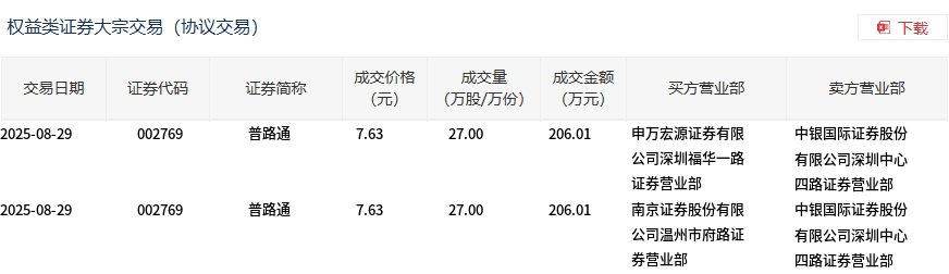 8月29日,普路通大宗交易成交54万股,成交额412.02万元,占当日总成交额的4.2%,成交价7.63元,较市场收盘价8.4元折价9.17%。