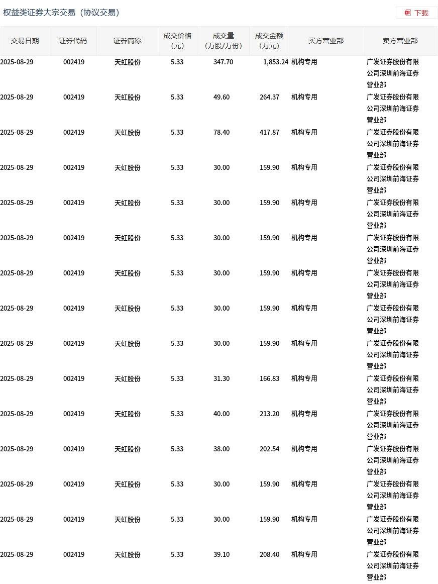 8月29日,天虹股份大宗交易成交864.1万股,成交额4605.65万元,占当日总成交额的25.62%,成交价5.33元,较市场收盘价5.86元折价9.04%。