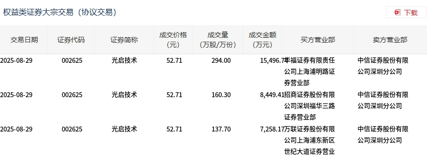 8月29日,光启技术大宗交易成交592万股,成交额3.12亿元,占当日总成交额的9.06%,成交价52.71元,较市场收盘价54.34元折价3%。