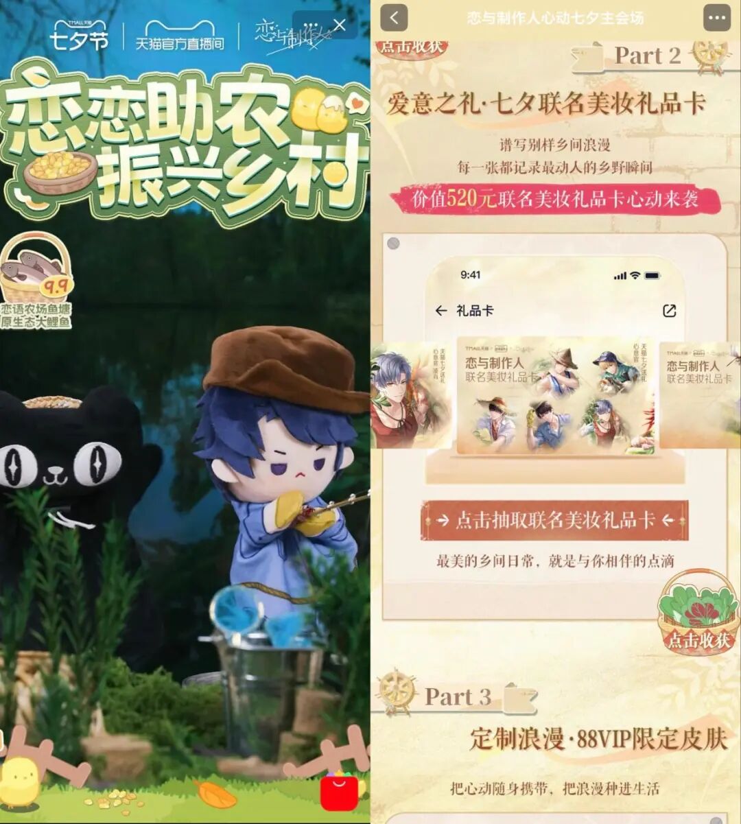 《恋与制作人》联手天猫与88VIP,将五位“霸总精英”变身为“恋语四季农场”代言人。“这么欢,这么爽,七夕就来恋语四季农场”,诸如此类接地气的口号结合“糙汉老公宠上天”“我家公子会插秧”等短剧味儿话题,将七夕叙事嫁接于助农主题。