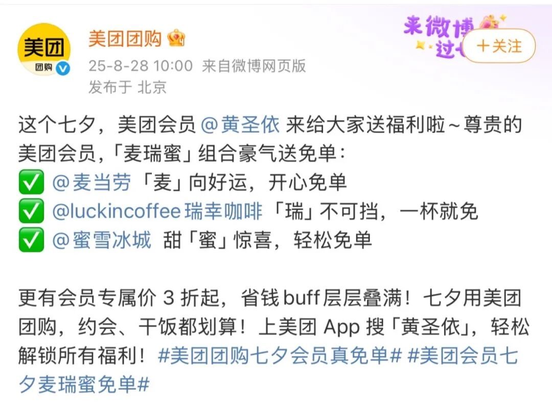 美团推出席卷社交平台的“麦瑞蜜”(麦当劳、瑞幸、蜜雪冰城)黑金会员零元免单活动,暗含Marry Me谐音梗,同时推出美团闪购万元礼金、联名鲜花限时特惠、美团跑腿1对1急送仪式感服务等,主打30分钟闪购鲜花/数码、轻医美项目、老字号炖罐外送等,带着年轻人组队“七夕捡垃圾”,回收丢弃鲜花外卖。
