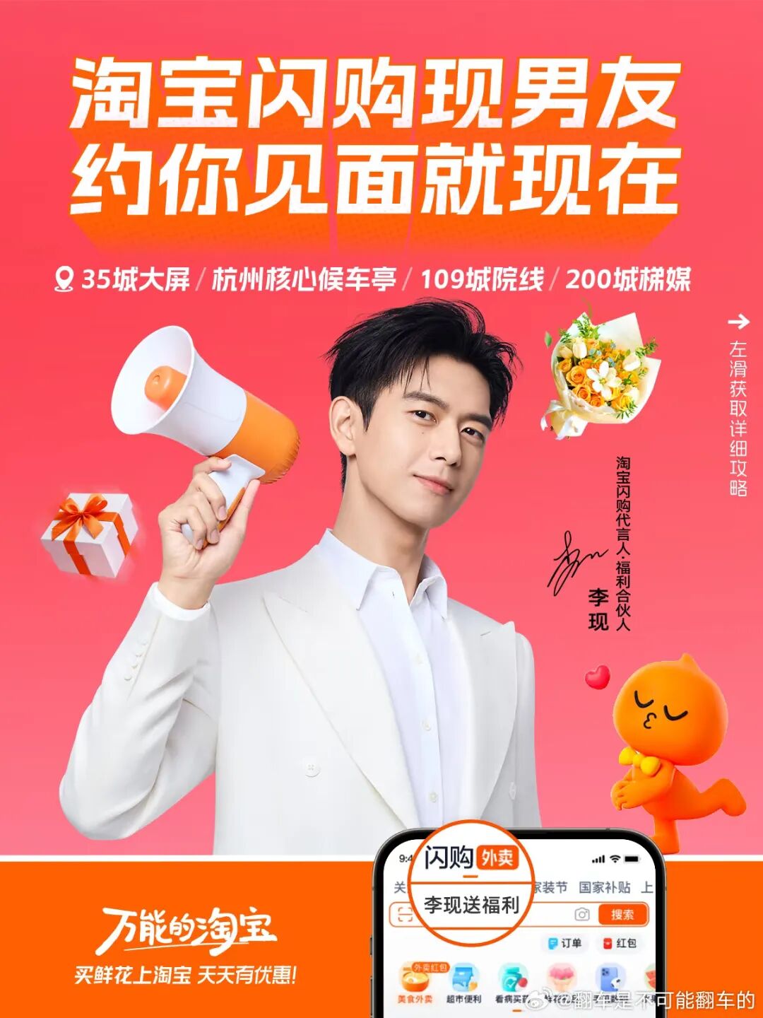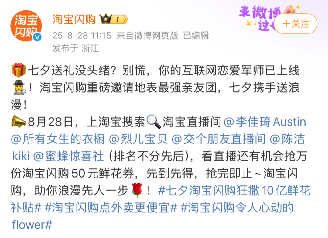 淘宝闪购主推10亿鲜花补贴,并邀请了李现、杨幂、林一等明星联动推出福利,杭州、北京等35城地标大屏投放明星主题广告,展开餐饮、美妆、数码全品类延伸优惠,在淘宝APP上搜索“七夕闪购”或“李现送福利”即可进入活动页,并在李佳琦等主播直播间同步发放优惠券。