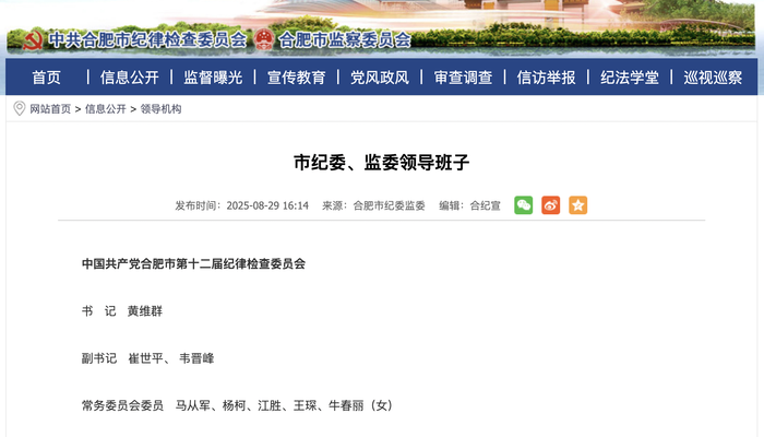 据安徽合肥市纪委监委官网消息,其“领导机构”一栏近日更新显示,韦晋峰已任合肥市纪委副书记。此外,8月27日合肥市第十七届人民代表大会常务委员会第二十八次会议通过任免人员名单,其中:任命韦晋峰为市监察委员会副主任。