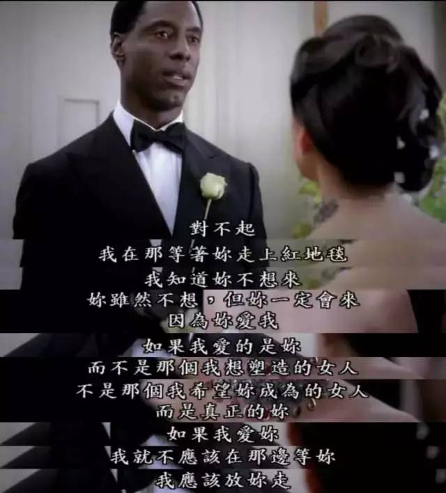 婚礼上,她迟迟不能定下心进场。在压力之下两人分手,虽然她伤心欲绝,穿着婚纱在空荡荡的房子里的身影让人倍感心疼,但最后,她还是告诉好朋友Meredith:“我终于自由了。”