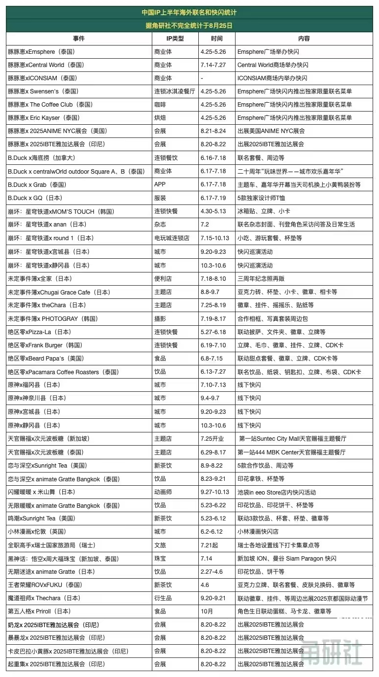 角研社统计了22个国创ACG内容IP今年上半年,在中国大陆以外地区的联名和联动情况,共39起。