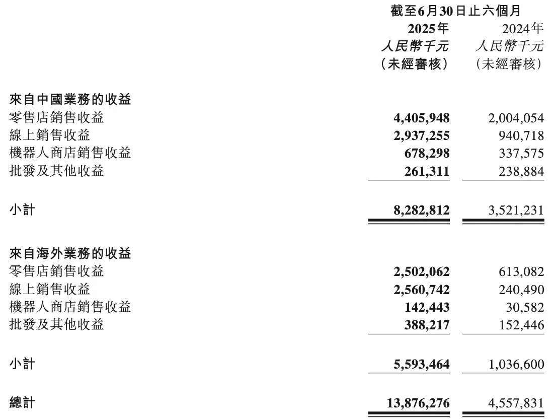 值得注意的是,泡泡玛特上半年来自海外市场的总收入为55.93亿元,线上销售收入占比最大——线下零售店和线上销售,分别为25亿元和25.61亿元。