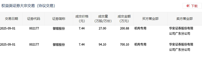 9月1日,御银股份大宗交易成交121.1万股,成交额900.98万元,占当日总成交额的0.68%,成交价7.44元,较市场收盘价8.5元折价12.47%。
