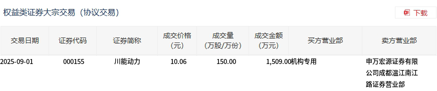 9月1日,川能动力大宗交易成交150万股,成交额1509万元,占当日总成交额的7.89%,成交价10.06元,较市场收盘价10.16元折价0.98%。