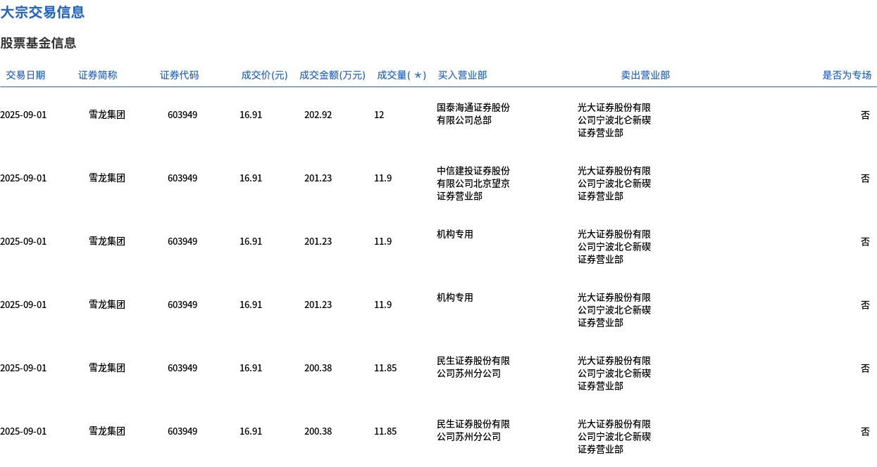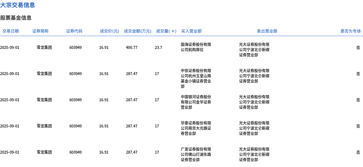 9月1日,雪龙集团大宗交易成交163.1万股,成交额2758.02万元,占当日总成交额的12.94%,成交价16.91元,较市场收盘价19.69元折价14.12%。