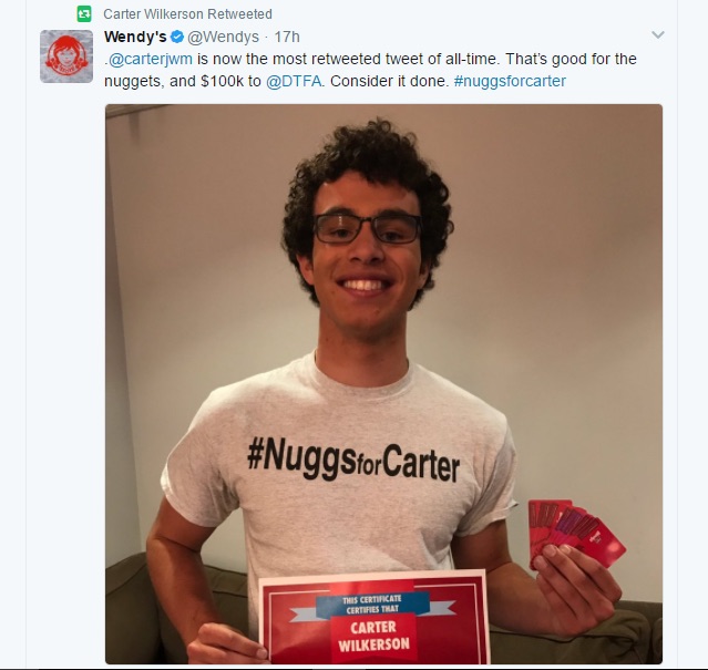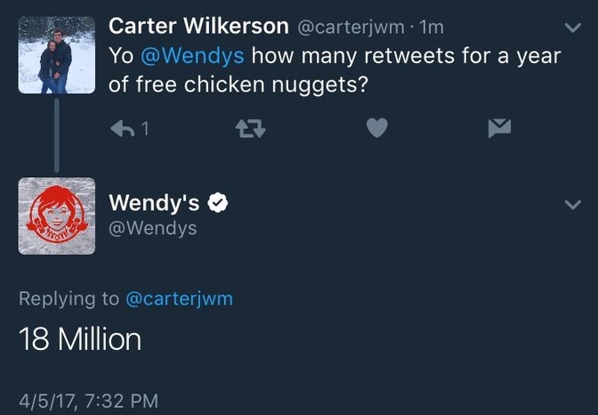 而美国连锁快餐公司Wendy’s立即给了他回复,答案是一个惊人数字,1800万次。Wilkerson开始在Twitter上邀请大家为自己转发,为了获得一年期的鸡块——对了,他还说自己更喜欢蜂蜜口味的蘸酱。