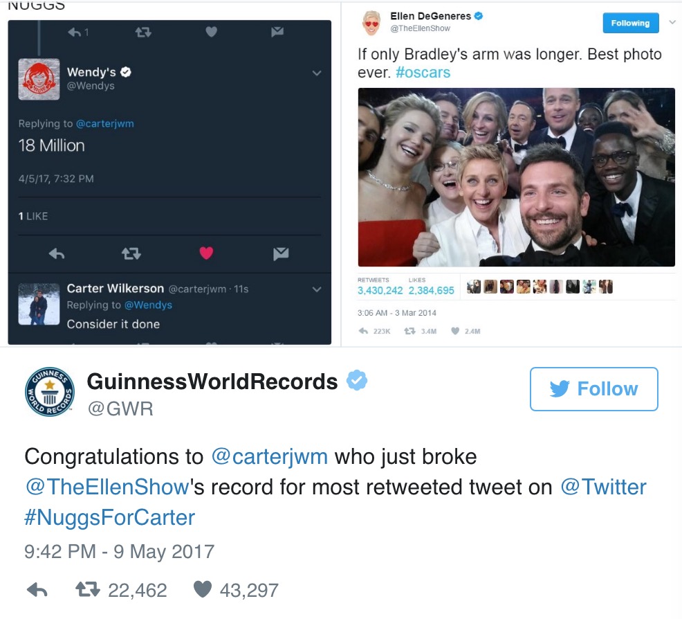 或许只是意外,也有可能是大家太过于无聊, #NuggsForCarter成为了近一个月以来推特上的热门话题。随着转发人数不断增加,Wendy’s也降低了挑战的难度,只要超过现在转发记录的保持者,那么就算完成。而当时的记录是脱口秀主持人Ellen DeGeneres创下的,她在 86 届奥斯卡颁奖典礼后,上传了一张整容超级豪华的自拍。