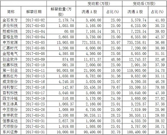 Wind统计数据则显示,仅5月份A股市场涉及首发原始固定解禁的股票就有21家,5月15日至31日之间的也有11只。其中金冠电气此轮解禁后流通股将从占股本的25.08%提高到51.51%,解禁规模解接近目前流通股规模。威龙股份、百利科技、帝王洁具、恒泰实达、天顺股份等解禁后流通股占总股本比例也分别从25.05%、25%、25.01%、25.03%、25.01%提高到46.26%、47.50%、37.38%、50.52%、50.71%,解禁市值均占流通股比例较大。
