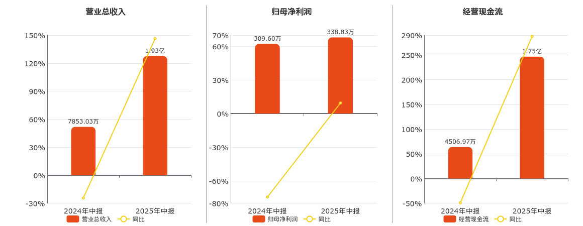 公司营业总收入为1.93亿元,较去年同报告期营业总收入增加1.15亿元,同比较去年同期上涨146.25%。归母净利润为338.83万元,较去年同报告期归母净利润增加29.23万元,同比较去年同期上涨9.44%。经营活动现金净流入为1.75亿元,在已披露的同业公司中排名第27,较去年同报告期经营活动现金净流入增加1.30亿元,同比较去年同期上涨287.35%。