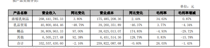 具体来看,奶油实现了两位数增长,但绝对值仍然较小;主要面向B端的奶酪,受市场竞争加剧影响下降较多;椰品类产品,又因原料涨价的压力,导致利润表现不甚理想,业务毛利率直接降为-4.93%。