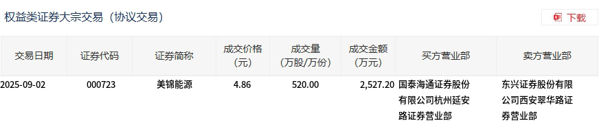 9月2日,美锦能源大宗交易成交520万股,成交额2527.2万元,占当日总成交额的5.54%,成交价4.86元,较市场收盘价4.83元溢价0.62%。