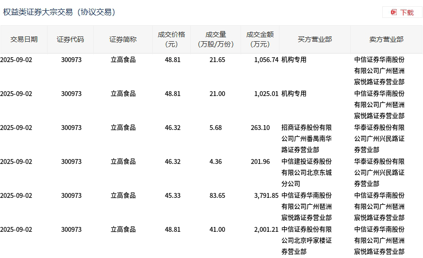 9月2日,立高食品大宗交易成交177.34万股,成交额8339.87万元,占当日总成交额的29.13%,成交均价47.03元,较市场收盘价49.81元折价5.59%,其中最高成交价48.81元,最低成交价45.33元。