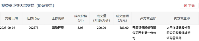 9月2日,清新环境大宗交易成交200万股,成交额786万元,占当日总成交额的14.11%,成交价3.93元,较市场收盘价4.09元折价3.91%。