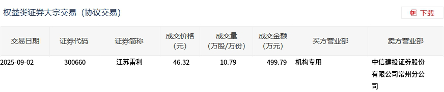 9月2日,江苏雷利大宗交易成交10.79万股,成交额499.79万元,占当日总成交额的0.32%,成交价46.32元,较市场收盘价52.47元折价11.72%。