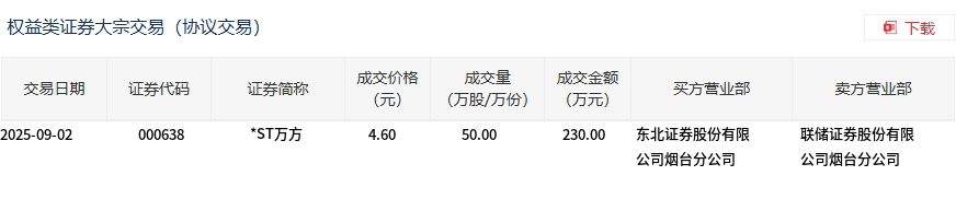 *ST万方今日大宗交易折价成交50万股,成交额230万元
