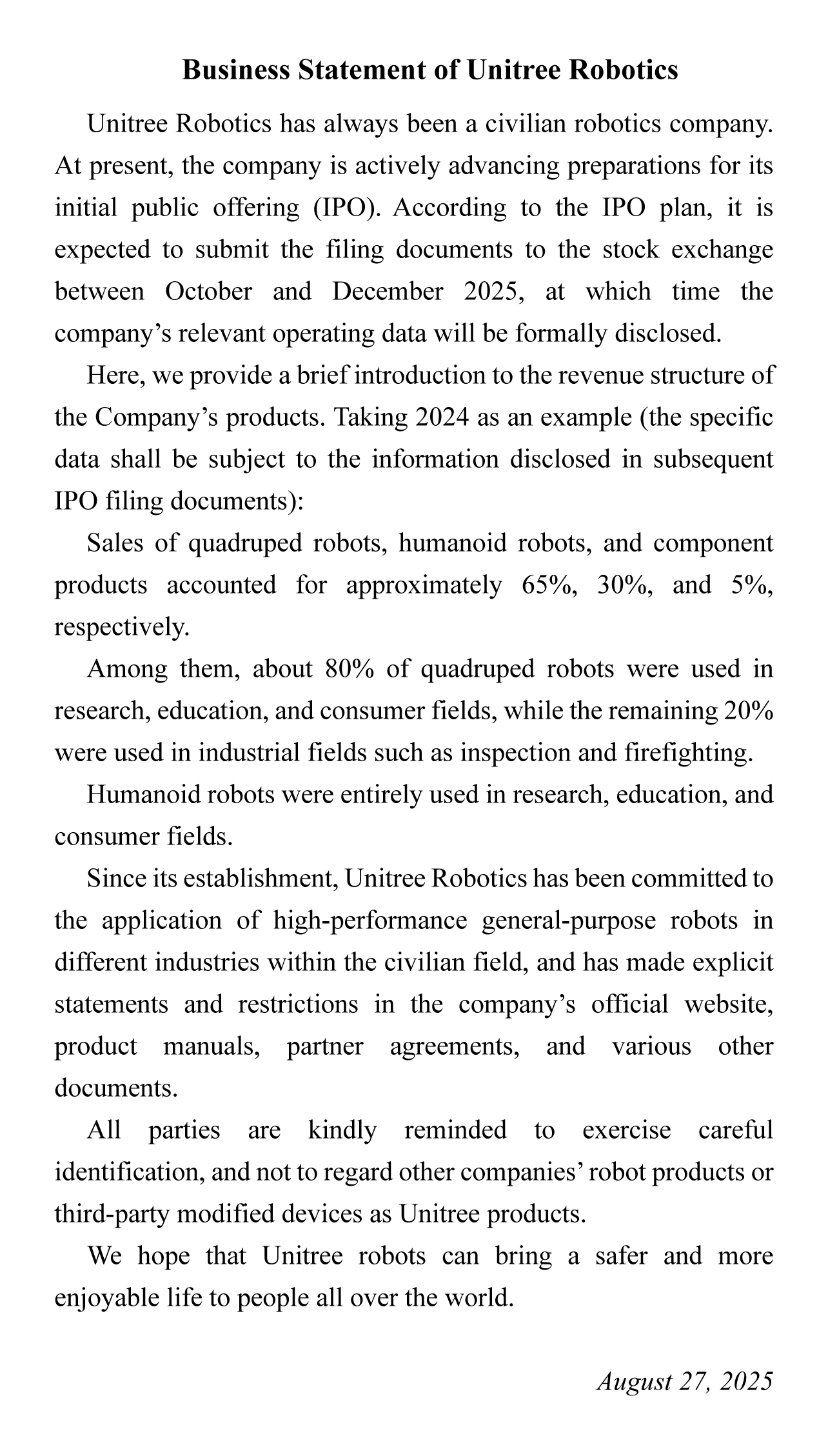 9月2日,宇树科技宣布,预计将在2025年10月至12月期间向证券交易所提交上市申请文件,届时公司的相关运营数据将正式披露。宇树科技表示,以2024年为例,四足机器人、人形机器人和组件产品的销售额分别占约65%、30%和5%。其中,约80%的四足机器人被应用于研究、教育和消费领域,而剩余的20%则被用于工业领域,如检查与消防。人形机器人完全用于研究、教育和消费领域。