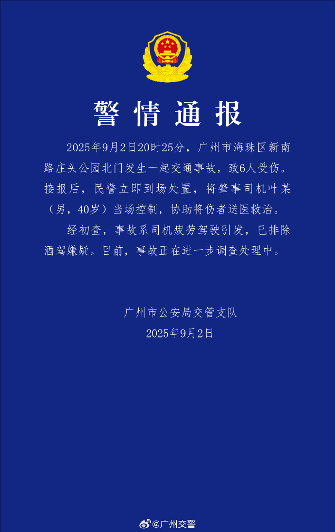 广州市公安局交管支队通报,9月2日20时25分,广州市海珠区新南路庄头公园北门发生一起交通事故,致6人受伤。接报后,民警立即到场处置,将肇事司机叶某(男,40岁)当场控制,协助将伤者送医救治。经初查,事故系司机疲劳驾驶引发,已排除酒驾嫌疑。目前,事故正在进一步调查处理中。