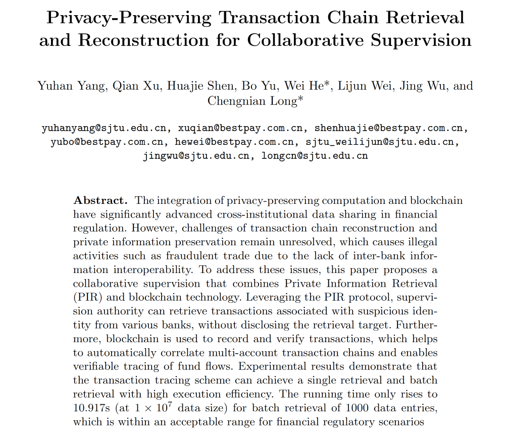 面向数据流通过程中的监管成本高、隐私信息披露等问题,翼支付区块链研究院团队融合区块链与隐匿查询技术(Private Information Retrieval, PIR)提出关联账户交易链查询与重建方案,协同“区块链+PIR”构建联合监管范式,可支持监管机构在不透露检索目标的情况下从各银行检索与可疑身份相关的交易,实现高效的批量化隐私信息检索,支撑监管机构对可疑账户的交易链追溯与重建。同时,利用区块链不可篡改、可追溯的特性,对交易信息进行记录与验证,能够自动关联多账户交易链条,实现资金流向的可验证追溯,为跨机构金融数据共享与协同监管提供了全新解决方案。