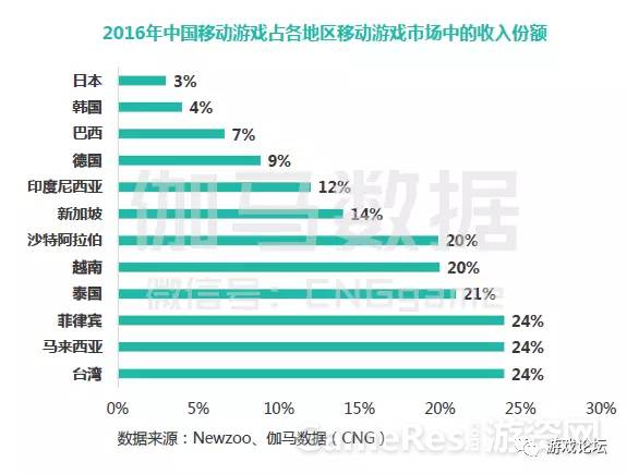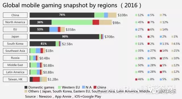 2016年主要移动游戏市场各国游戏占有率统计,其中黑色部分代表本国游戏占有率,由此可见进入日本市场的难度(图表来源:游族网络)